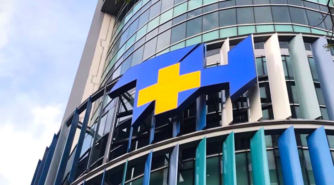 Hospital entrance signage: Letters and logo with bordered edges, painted, and concealed LED lighting (front-facing) for beautiful, sharp, and striking illumination at night. Modern and professional in appearance.